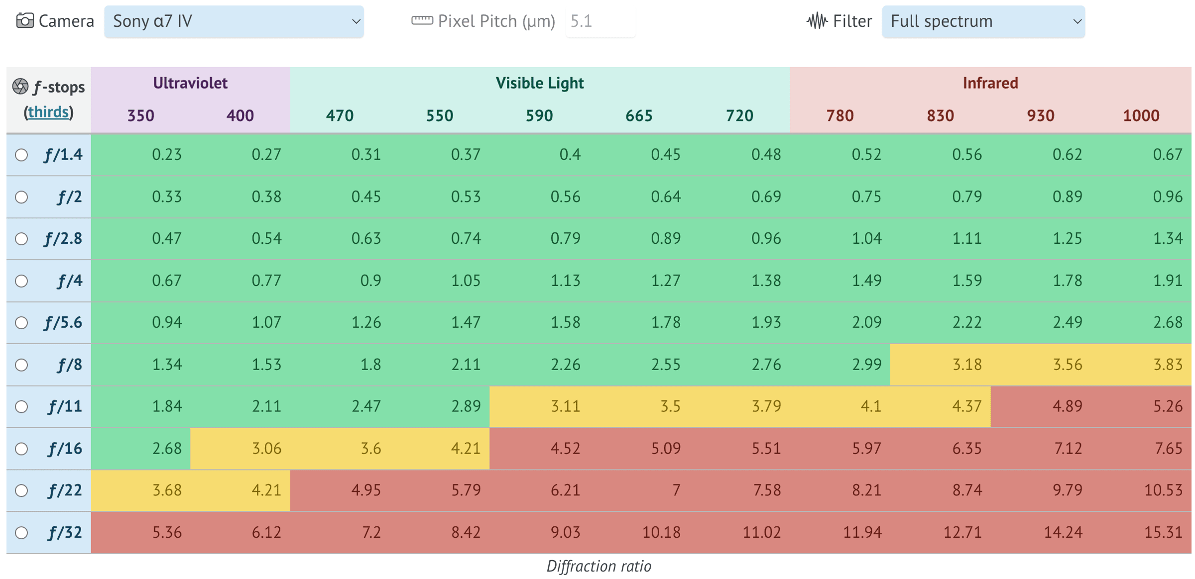 Diffraction Calculator Update I've updated the Visible Diffraction Calculator for Digital Cameras to provide more refined results. This free tool allows you to select your camera, your infrared filter, and then calculate how much visible diffraction will appear in your images at various ƒ-stops. Diffraction calculator with whole-stop increments The original version allowed you to view the results in whole ƒ-stop increments. This update allows you to view results in either whole or 1/3-stop...